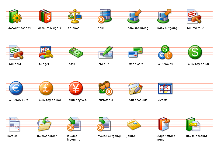 The Business Icon Set is ideal for general finance and business applications. It includes accounting, currency and book-keeping images. Great for Point of Sale applications, order forms and banking software.
