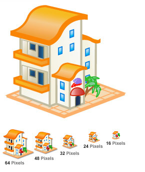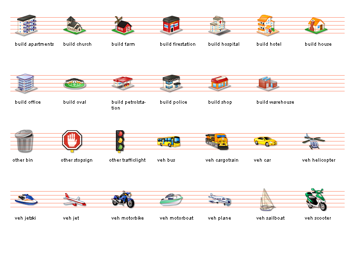 The City Icon Set includes icons of vehicles and buildings and other objects from the urban landscape, representing the most common aspects of urban life.