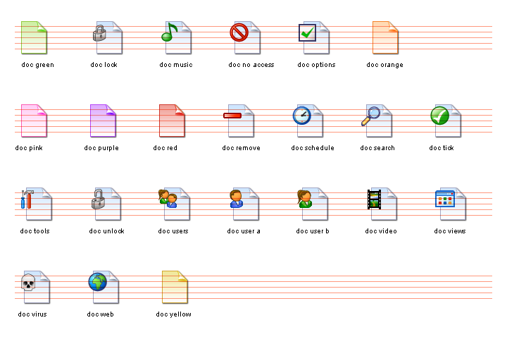 The Document Icon Set gives application developers access to a large variety of document icons. Great for any application that integrates with the Windows shell, or would benefit from high quality document images. The documents themselves are done in a new style that fits in with the overall feel of the operating system, but also stand out with a unique look. Eight plain color versions are also supplied, making it very easy to create an icon specific to your application! This set makes a perfect complement to the Folder Set.