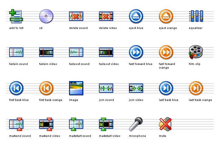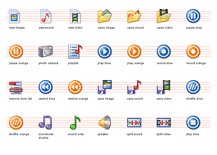 The Multimedia Set is designed specifically for image, audio & video applications. The selection of images are suitable for any editing, playback or recording applications, or any software that displays media functions to the user.