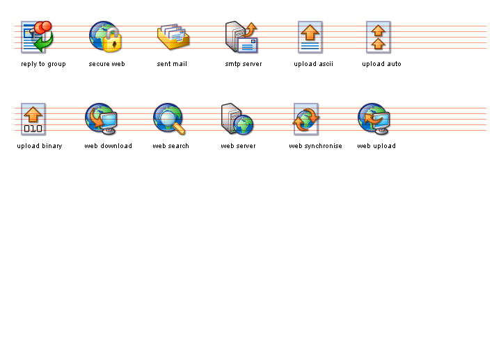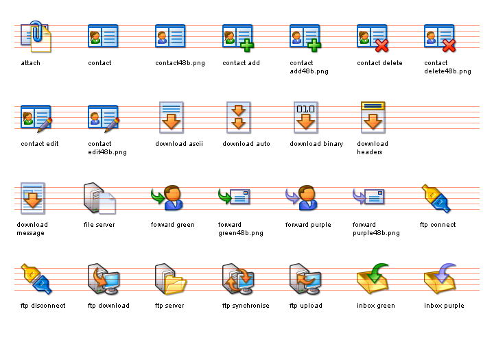 The Network I Icon Set for Windows XP™ is designed for internet enabled applications, or any software that features file transfers, messaging, email or contact management. It also features a selection of server and download/upload images.