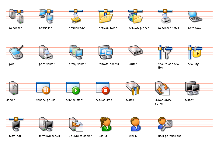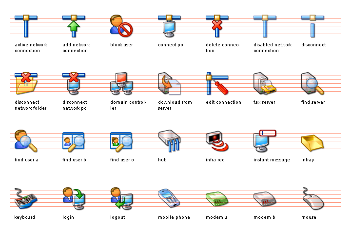 The Network II Icon Set for Windows XP™ includes hardware, security and local/remote networking images, and is a perfect complement to the Network I Set. It is primarily designed for system and network utilities, user management, security applications and hardware tools.