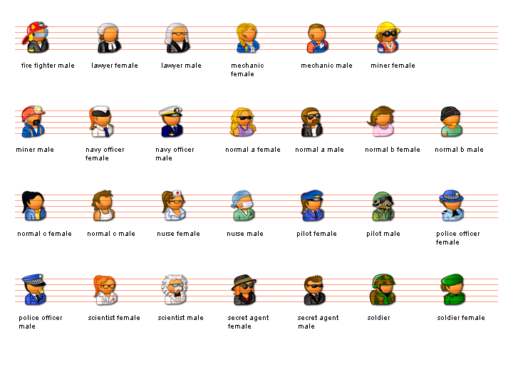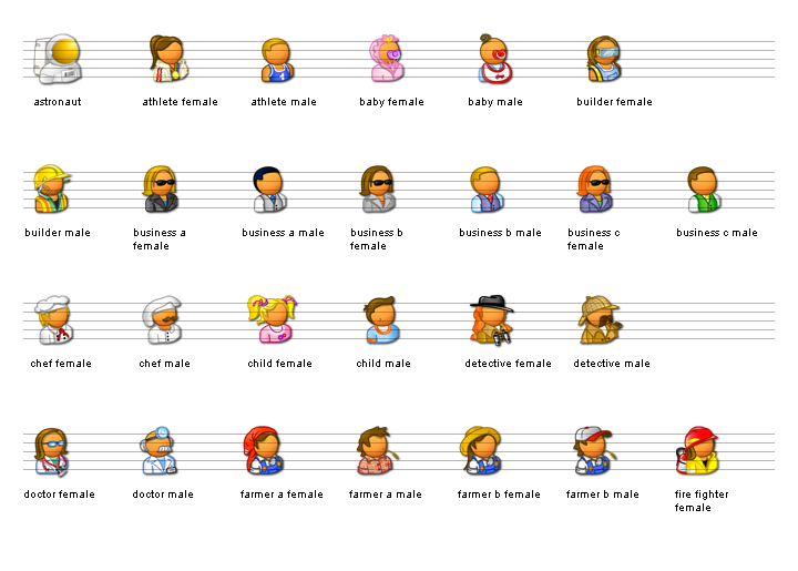 If you need more than just a generic person icon, the People Icon Set provides the perfect solution. Comprising a large selection of professions, in both male and female versions, as well as a large number of people in various outfits, your software will never be generic again! Police, firefighters, lawyers, doctors, soldiers, farmers, mechanics, babies, scientists and many more.