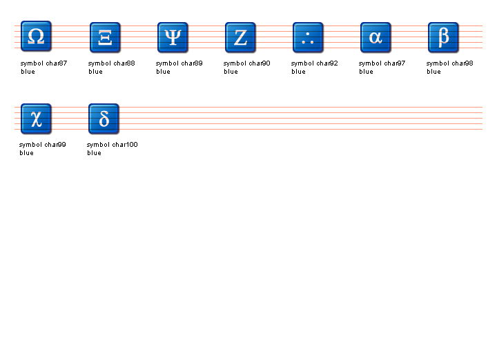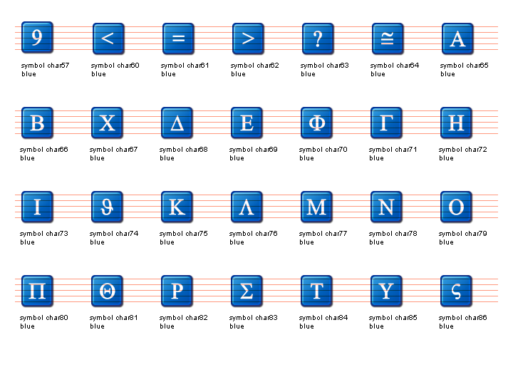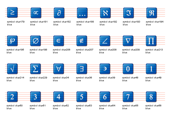 The Symbol Tile Icon Set is made to cater for applications that require special characters to be represented in the interface. It includes many of the special characters from the symbol ASCII set. Each symbol character is supplied at 2 sizes, 3 states and 7 different coloured backgrounds (blue, green, metallic, orange, purple, red and yellow).