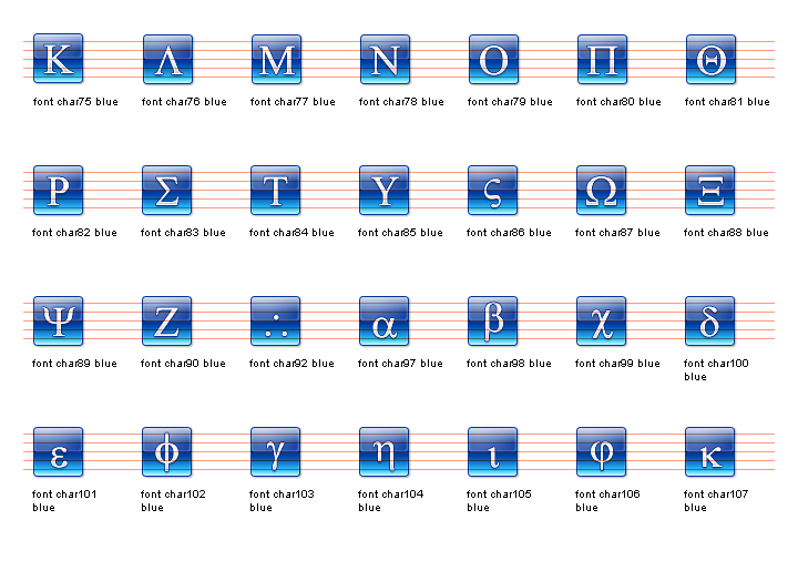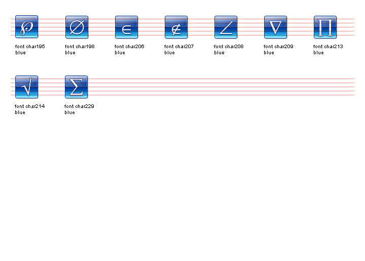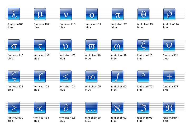 The Symbol Tile Icon Set is made to cater for applications that require special characters to be represented in the interface. It includes many of the special characters from the symbol ASCII set. Each symbol character is supplied at 2 sizes, 3 states and 7 different coloured backgrounds (blue, green, metallic, orange, purple, red and yellow).