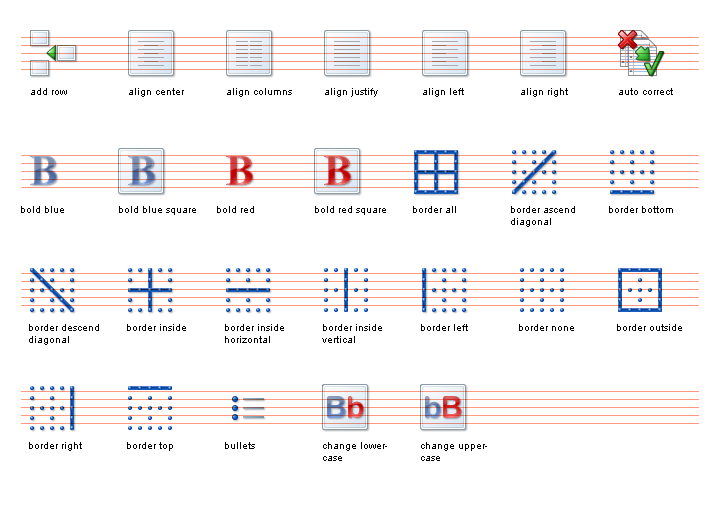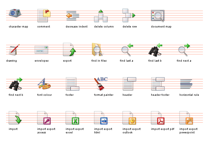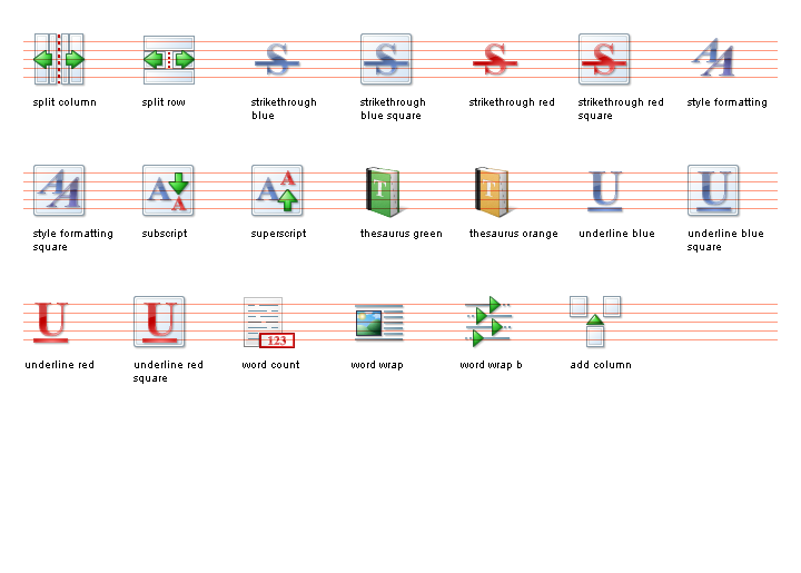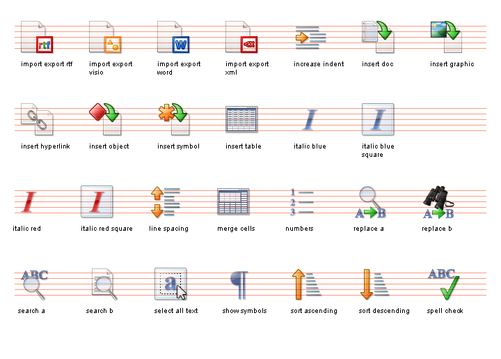 The Vista Word Processing Icon Set is ideal for any applications that allow users to manipulate text, graphics, tables, fonts and colours. Primarily suited for word processing and text editing software, this big collection of icons includes many import and export images, as well as borders and text styling.