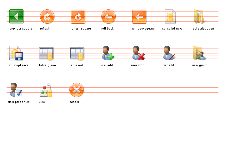 The Vista Database I Set contains images designed specifically for database applications. Includes enhanced glyphs for database navigation controls, as well as generic images suitable for any database with database functionality.